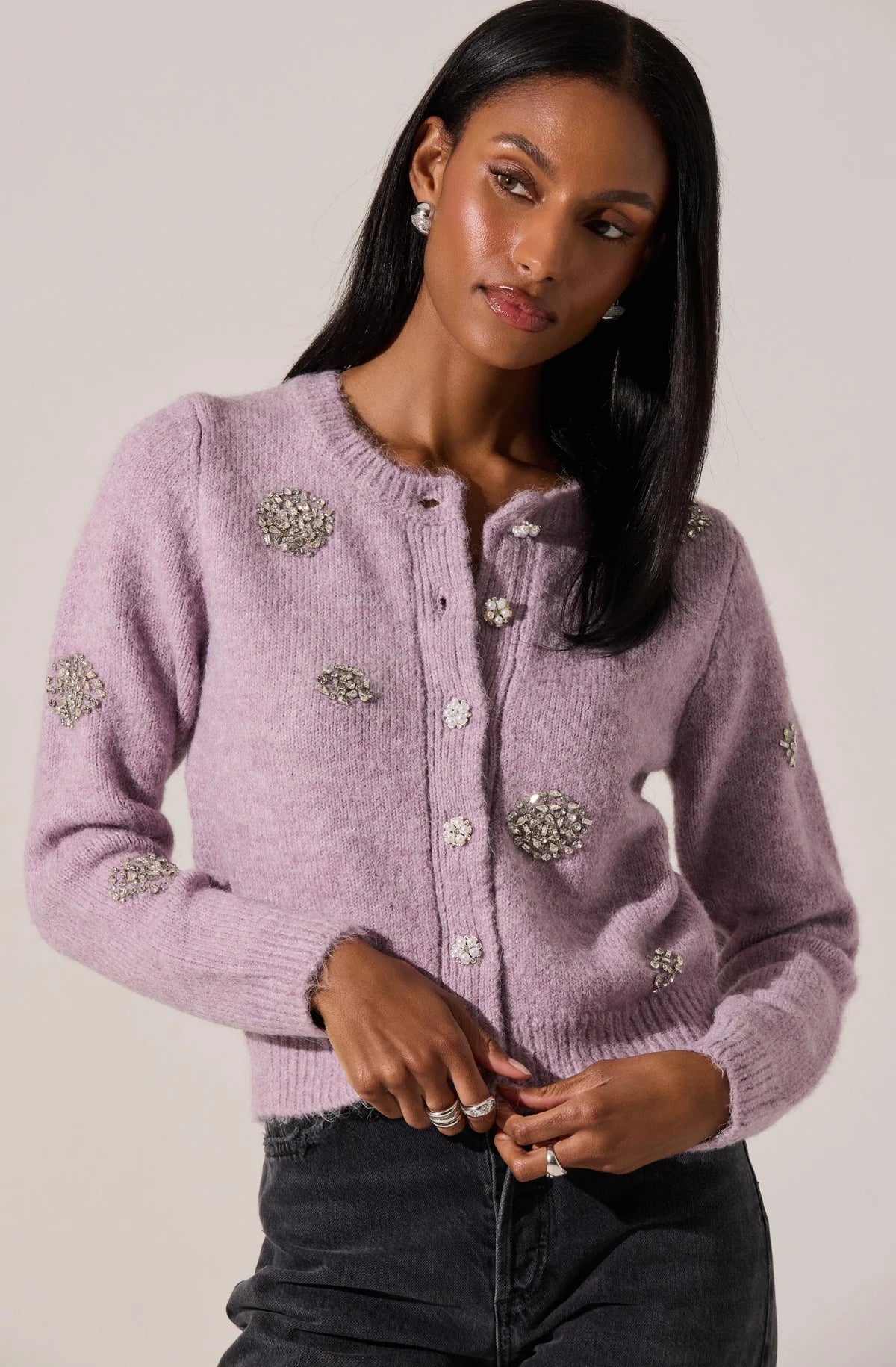 With its delicate jeweled embellishments, this brushed knit cardigan elevates everyday workwear while staying versatile for any occasion.