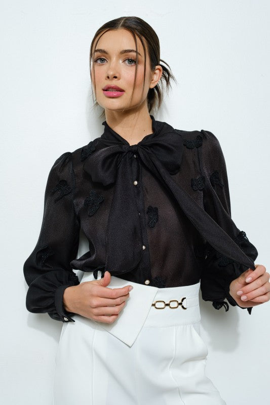 Sheer Embroidered Butterfly Bow Tie Blouse