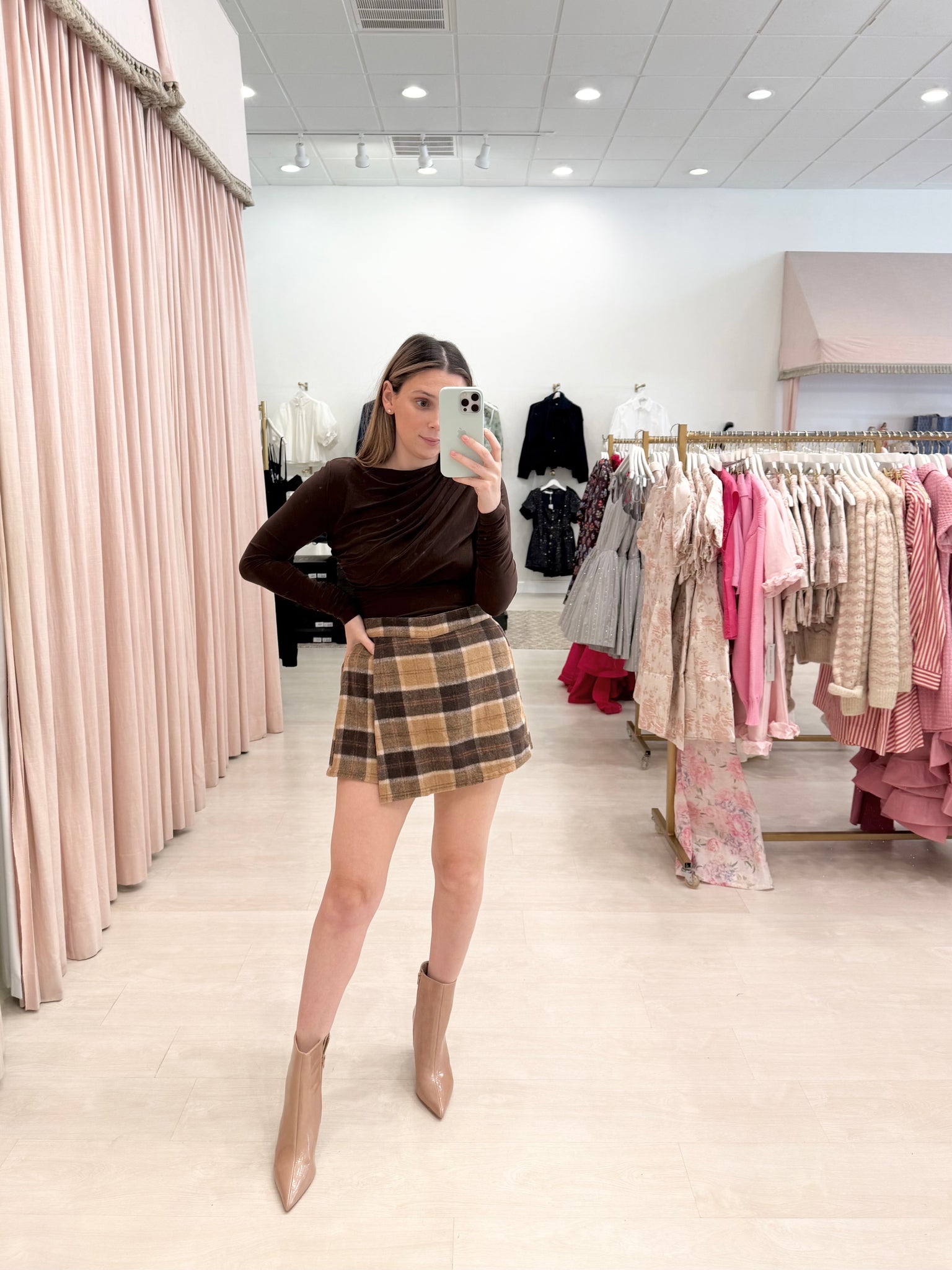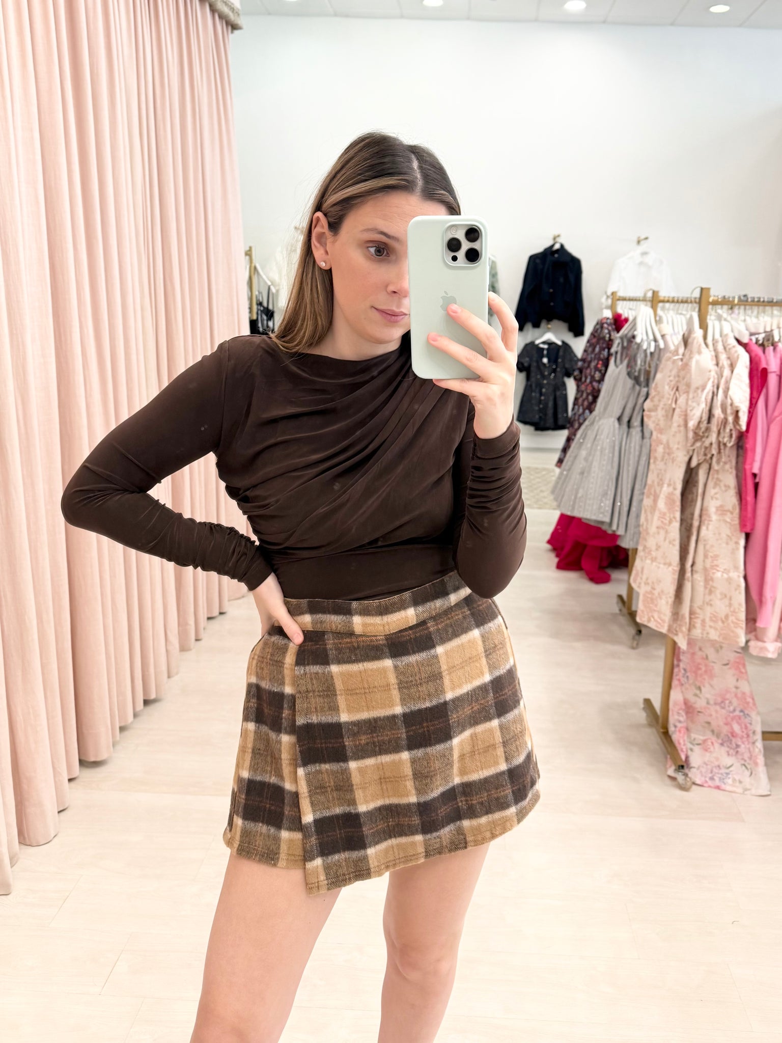 Add a flirty twist to your outfit with this Wrap Plaid Skort. Its soft brushed fabric keeps you comfy all day, while the playful plaid pattern and wrap detail bring fun, flirty vibes. Perfect for mixing casual and chic, it’s the go-to piece that flares up your style game with ease.