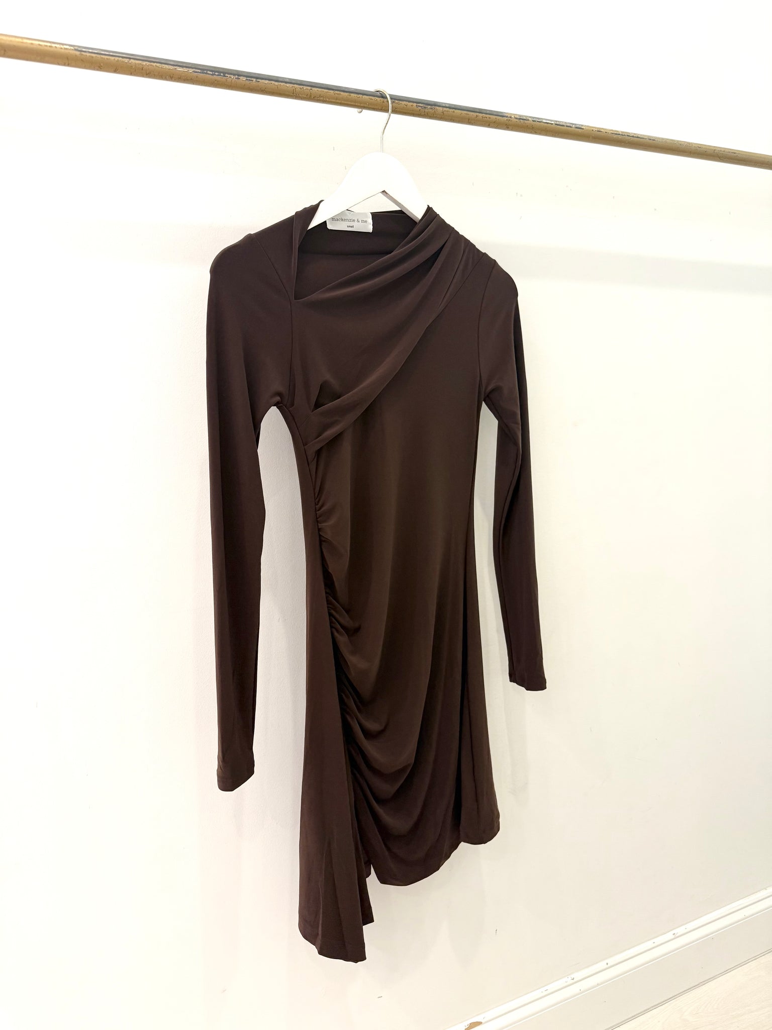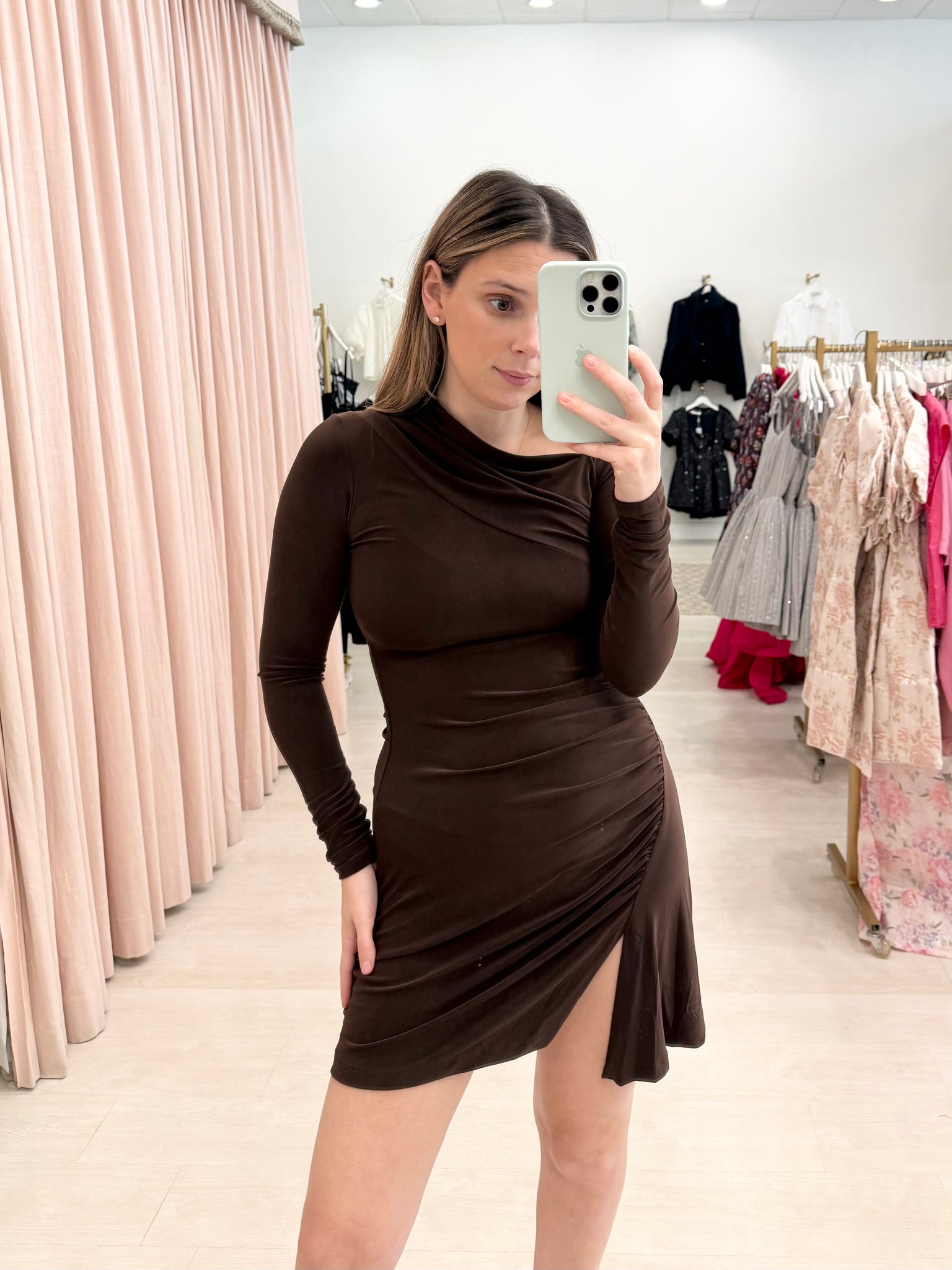 Our Drape Dress features an asymmetrical neckline and a draped hem. Runs fitted but TTS.