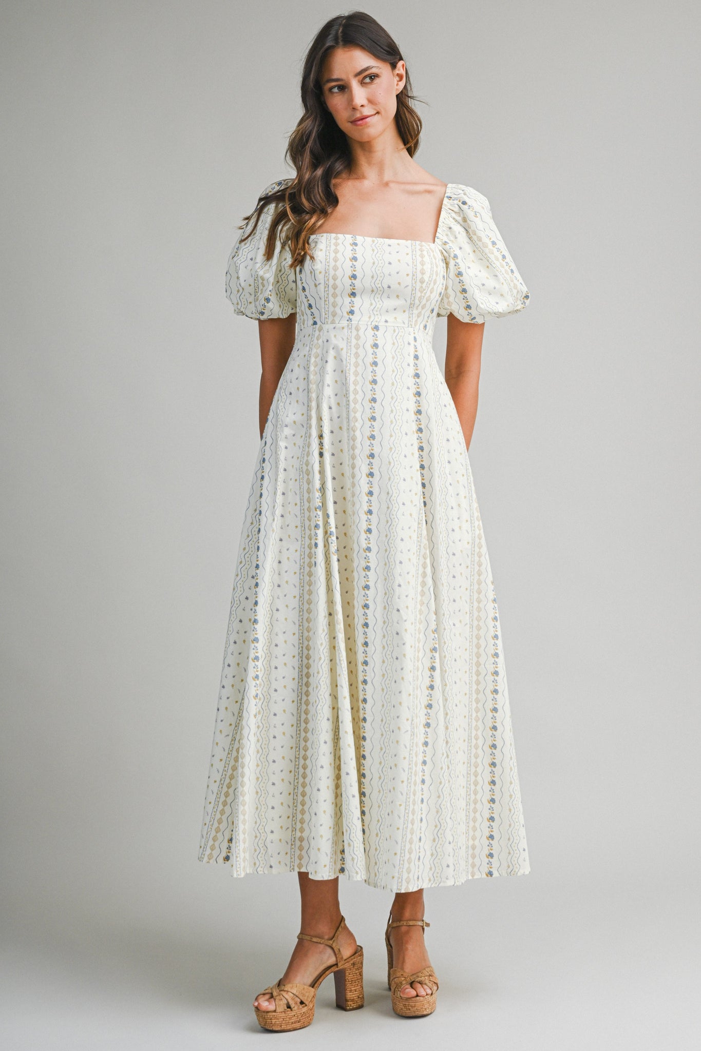 Short puff sleeve floral print babydoll midi dress with square neckline detail. Back smocked, invisible zipper and self tie detail.