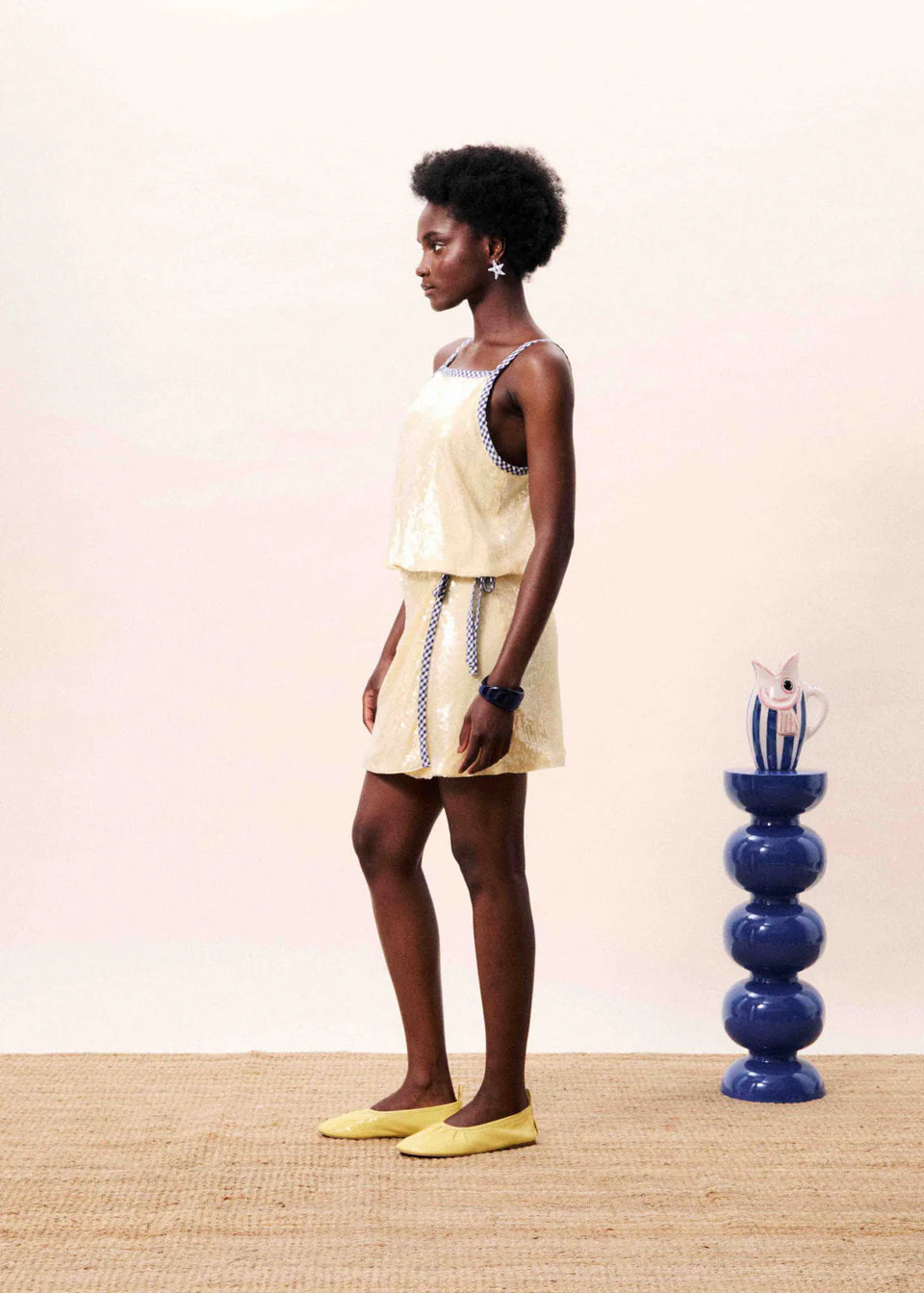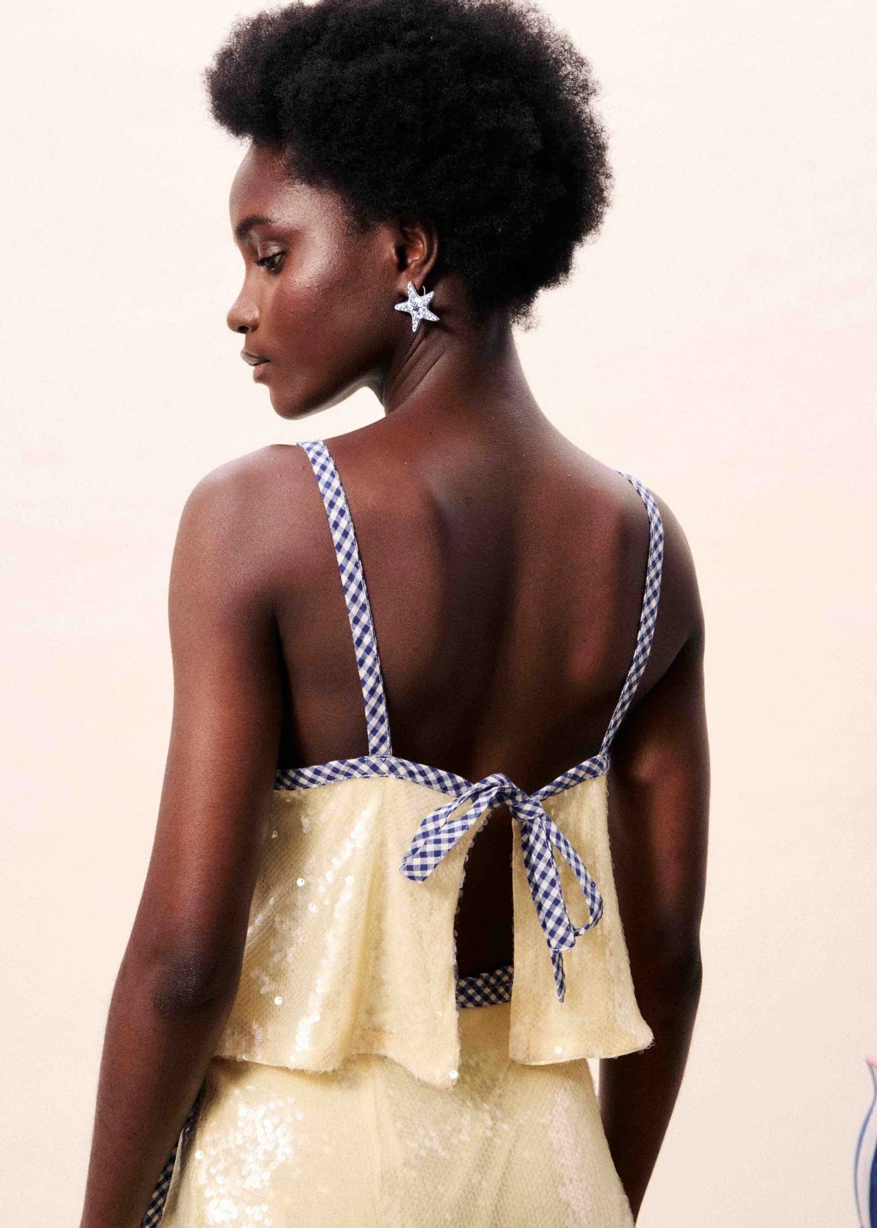 gingham sequined strappy top• Cropped top with thin straps• Blue and white gingham details on the straps and neckline• Completely covered in gold sequins• High, straight neckline• Slim fit