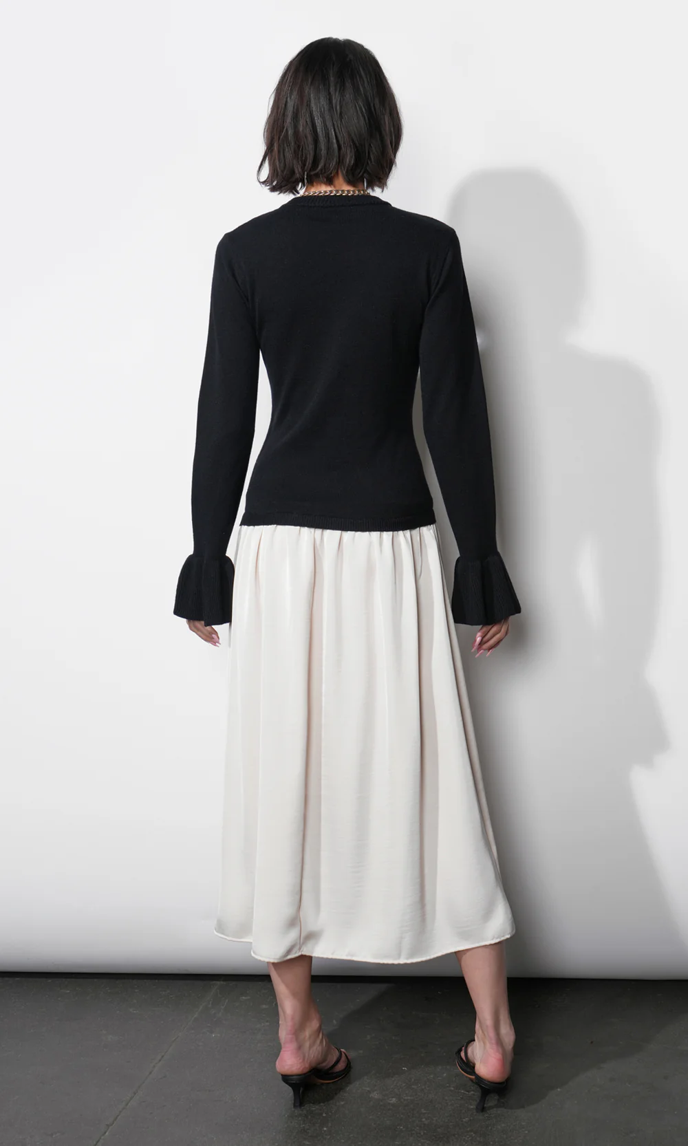 The soft knit sweater top contrasts beautifully with the flowy midi skirt, creating a polished and modern look. A balance of comfort and sophistication, this dress transitions seamlessly from day to night.