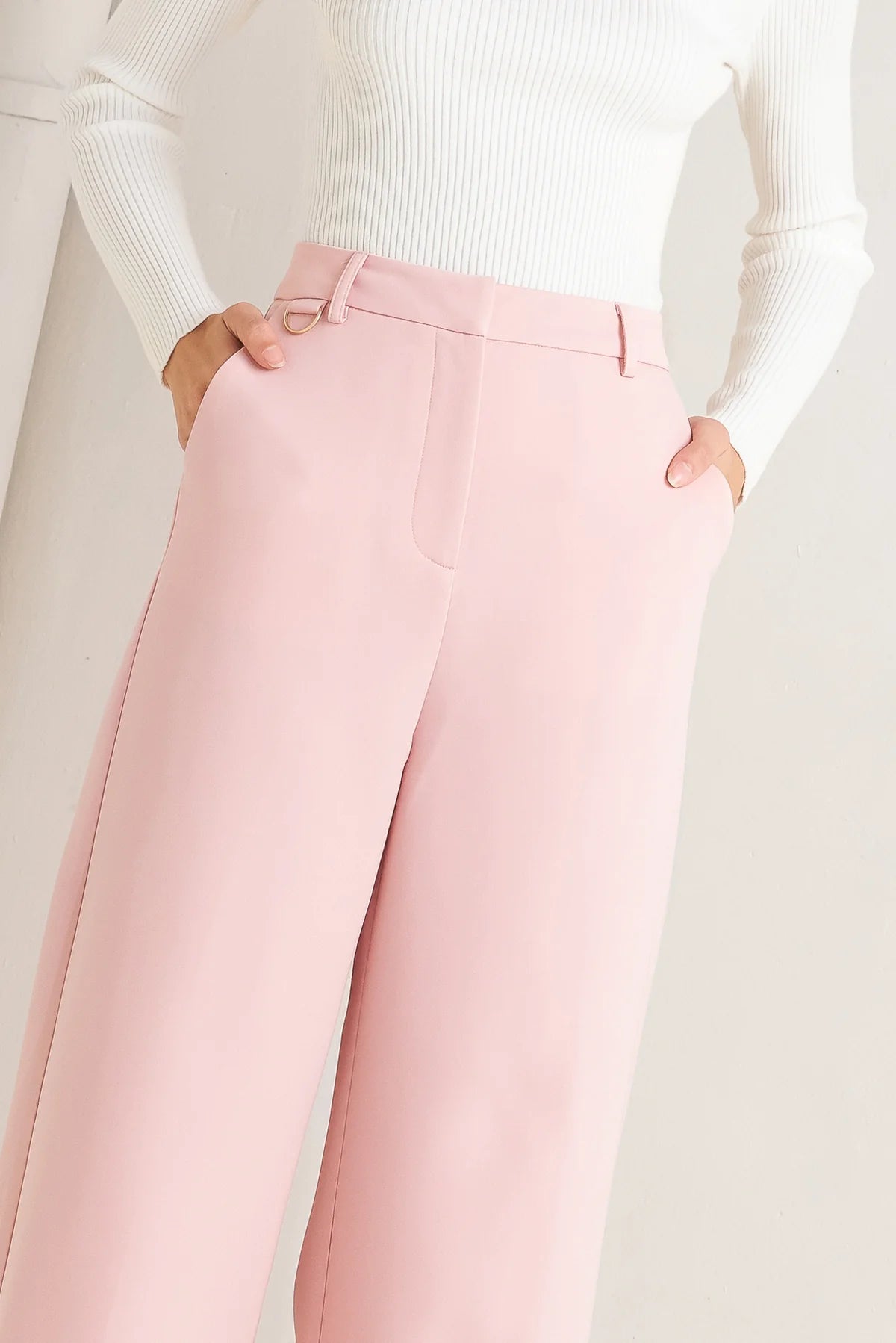 A solid woven pant featuring front closure, pockets and wide leg.