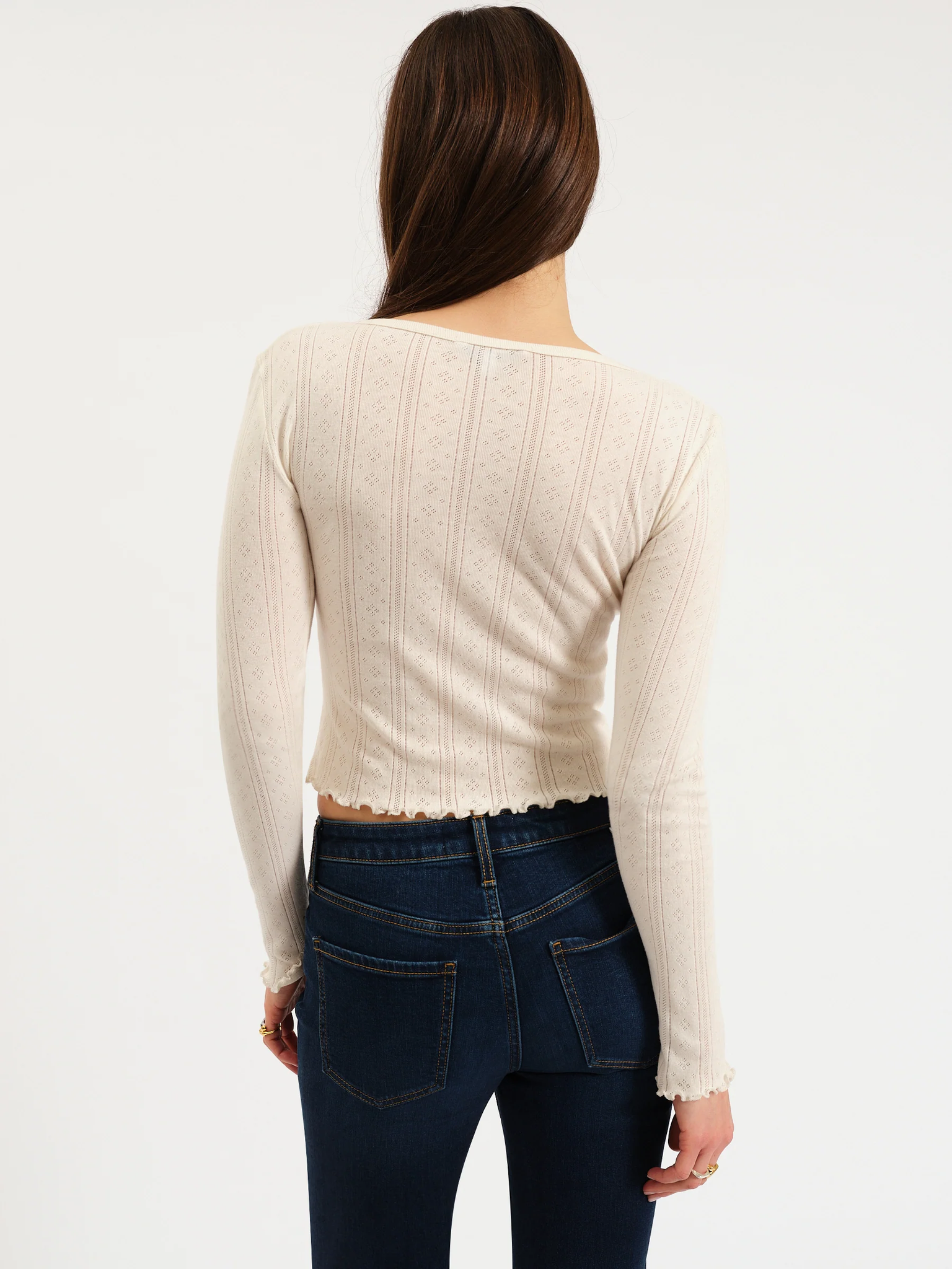 The Bunny in Cloud Dancer is a V-Neck Henley made of intricate, pointelle fabric and features vintage-inspired lettuce hems.