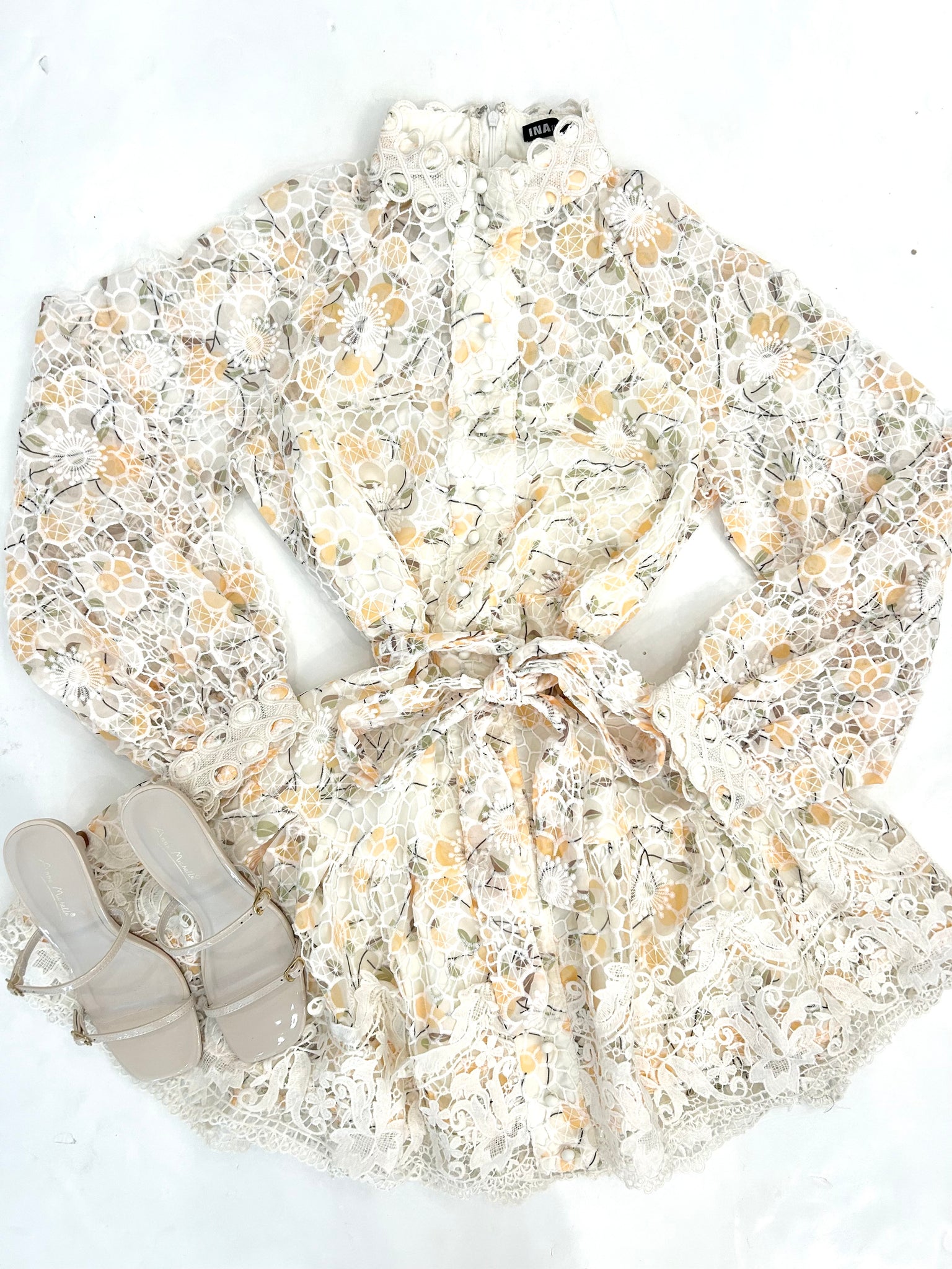 Step into romance with this Floral Embroidered Lace Mini Dress, where delicate floral lace meets playful puffed sleeves and a chic high neck. The ribbon tie at the waist creates a flirty, feminine shape, while the back zip closure ensures a perfect fit. Perfect for twirling through your day or night in vintage-inspired style!