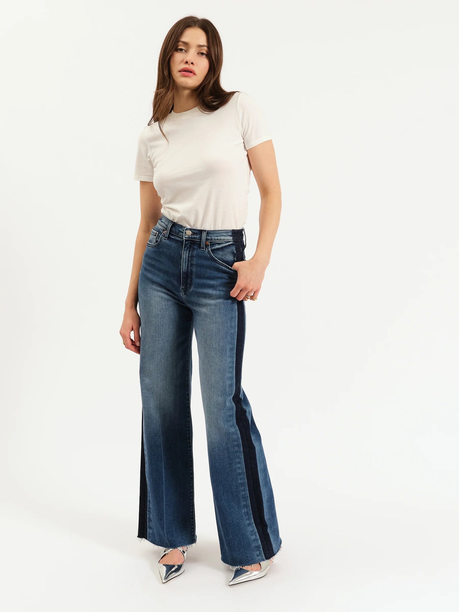 The cool girl jean just got even cooler, Far Out is a modern silhouette with black Tuxedo stripes across the sides of the legs for our take on denim tailored details. In a waist defining high rise, this wide leg is constructed in our "hug" denim that hugs your body, but has just enough weight to keep a structured fit