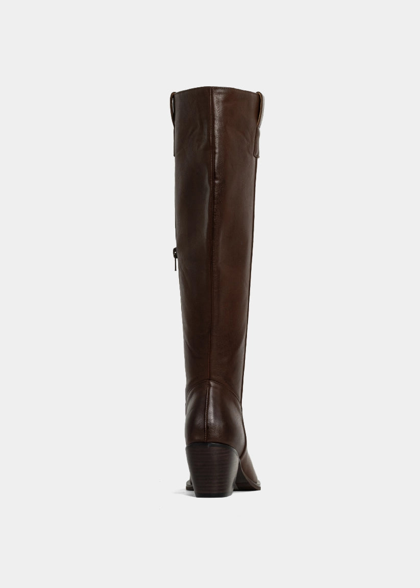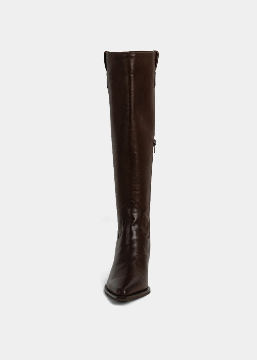Meet your tall-boot obsession. VIENNA is a timeless Western-inspired knee-high boot, reimagined in rich brown faux leather with a sleek square toe and low block heel. It’s made to elongate the leg while adding that effortless fall polish to any look, from tailored skirts to oversized knits. Whether you're styling for the city or channeling countryside chic, VIENNA brings confidence to every step.
